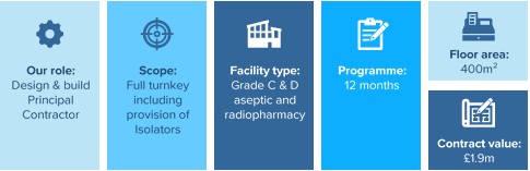 The new facility provides the hospital with modern, flexible, well-designed accommodation, compliant with MHRA requirements and achieved an MHRA license for Aseptic manufacturing.